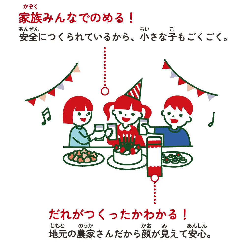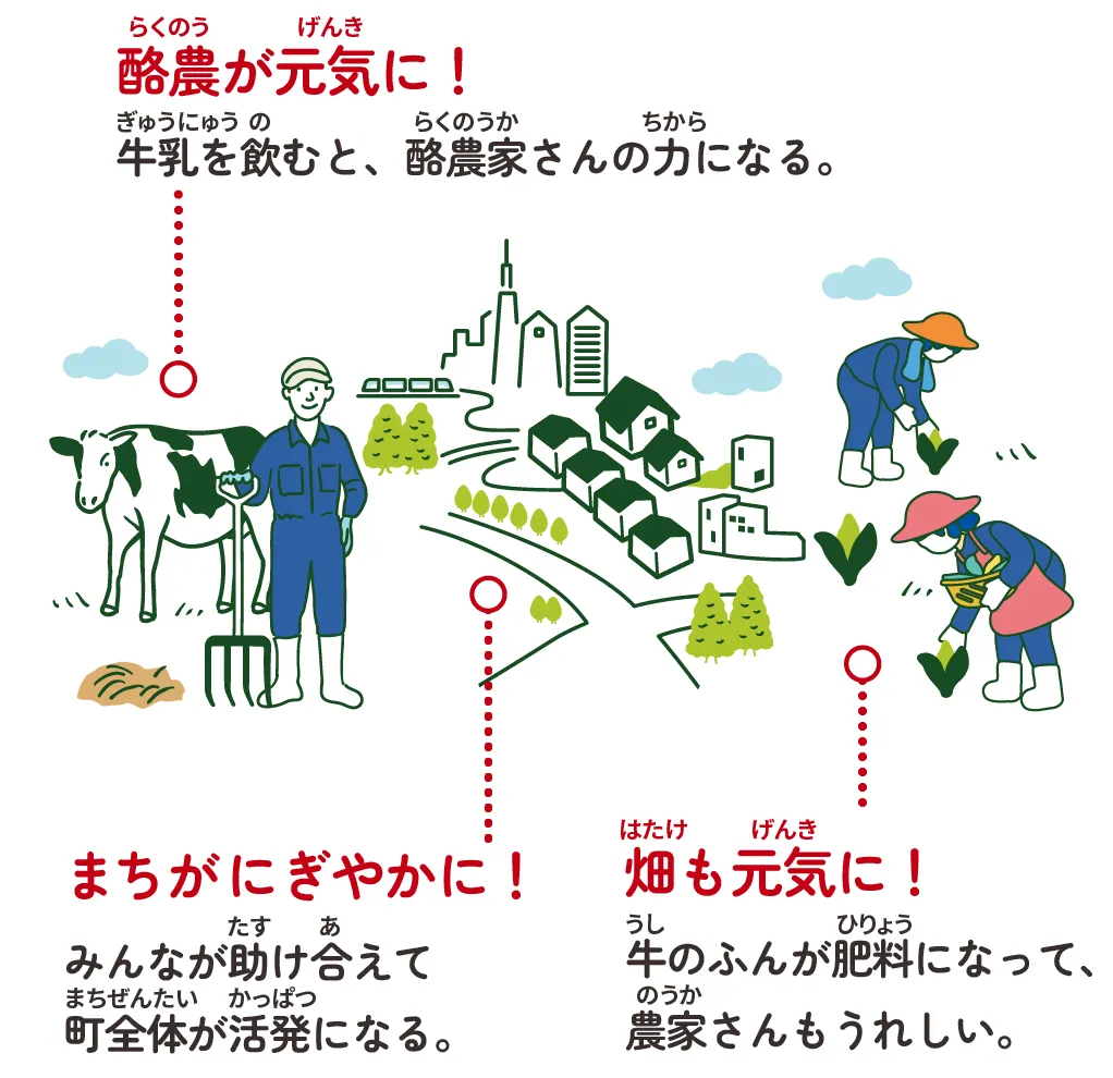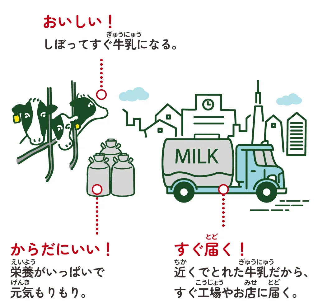給食やおうちで 牛乳やごはんを食べるときに、「作ってくれてありがとう」って思うだけでも地産地消につながるよ。